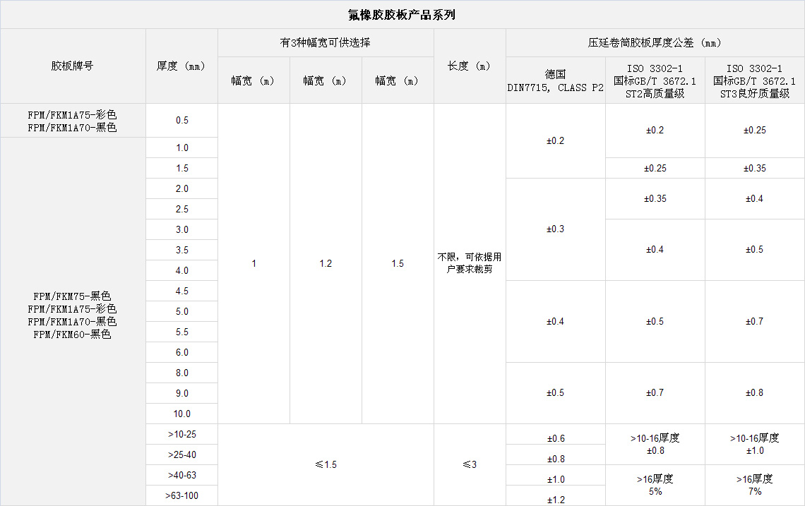 例如氟橡胶胶板牌号:FPM/FKM1A70-黑色 FKM:依据ASTM D1418标准,对氟橡胶的统称 (依据DIN/ISO标准则称为FPM);1A-表示优级品质;70-为邵氏硬度