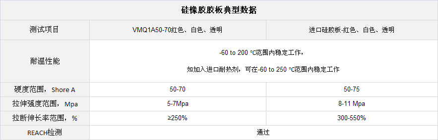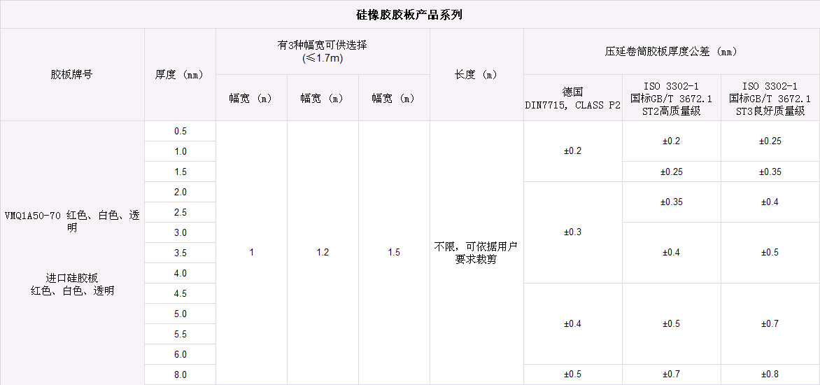 该类产品表面光亮平整。厚度公差小,各项物理指标好。耐热、耐低温、绝缘性、耐气候老化性能优良。纯胶板最宽1.7米最薄0.5毫米; 夹布最宽1.5米最薄1.0毫米,有多种硬度。买家有特殊技术要求的,如耐油、夹布、夹金属网等硅胶板,可协议定制。