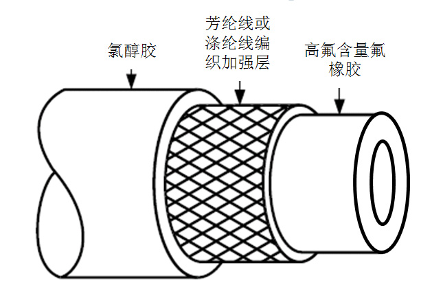该胶管内层采用高氟含量氟橡胶,中层为芳纶线或涤纶线等编织加强层,外套为氯醇胶,专为含甲醇类燃料油的输送而设计,具有极低的渗透率,并耐中低压等特点。